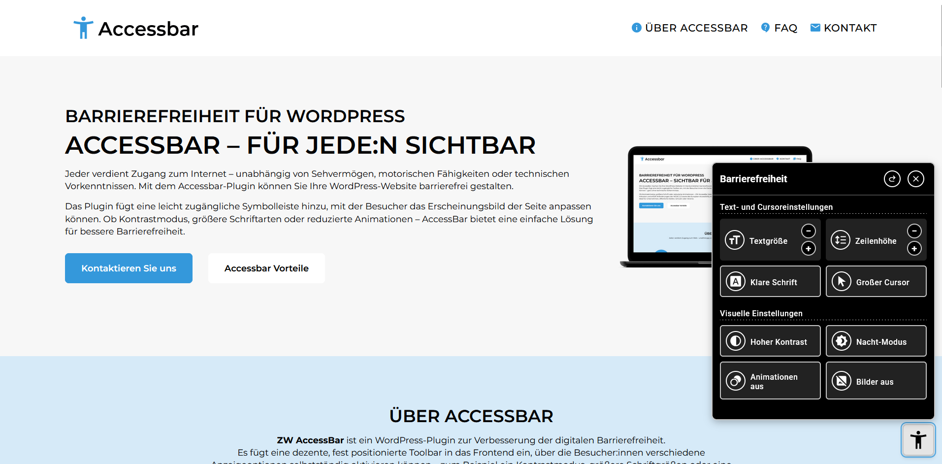 Das Plugin fügt eine leicht zugängliche Symbolleiste hinzu, mit der Besucher das Erscheinungsbild der Seite anpassen können. Ob Kontrastmodus, größere Schriftarten oder reduzierte Animationen – AccessBar bietet eine einfache Lösung für bessere Barrierefreiheit.