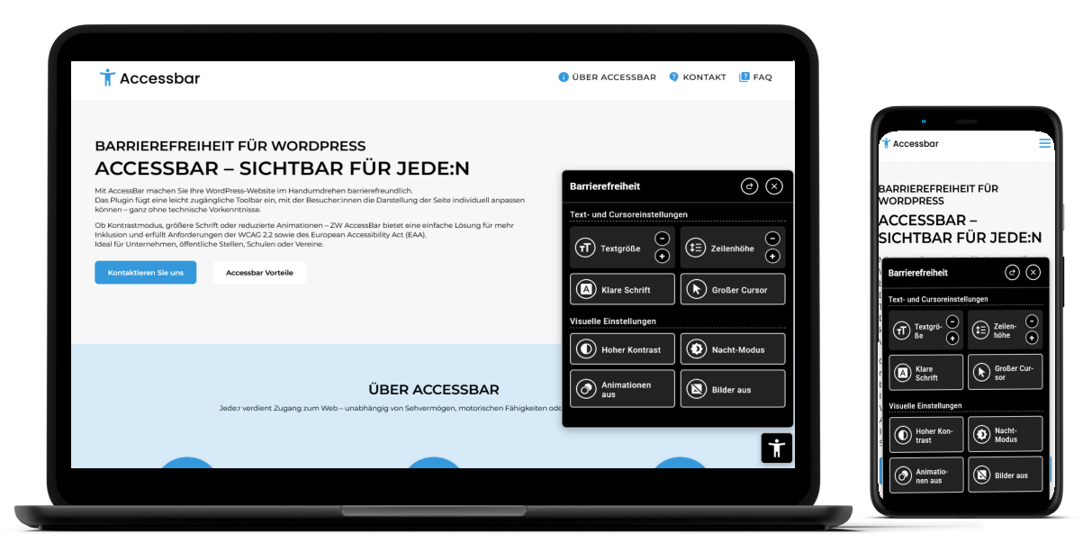 Das Plugin richtet sich an alle, die ihre Website inklusiver gestalten und Anforderungen wie der WCAG 2.2, der EN 301 549 und dem European Accessibility Act (EAA) gerecht werden möchten – ohne teure Drittanbieter oder komplexe Anpassungen und DSGVO-konform.